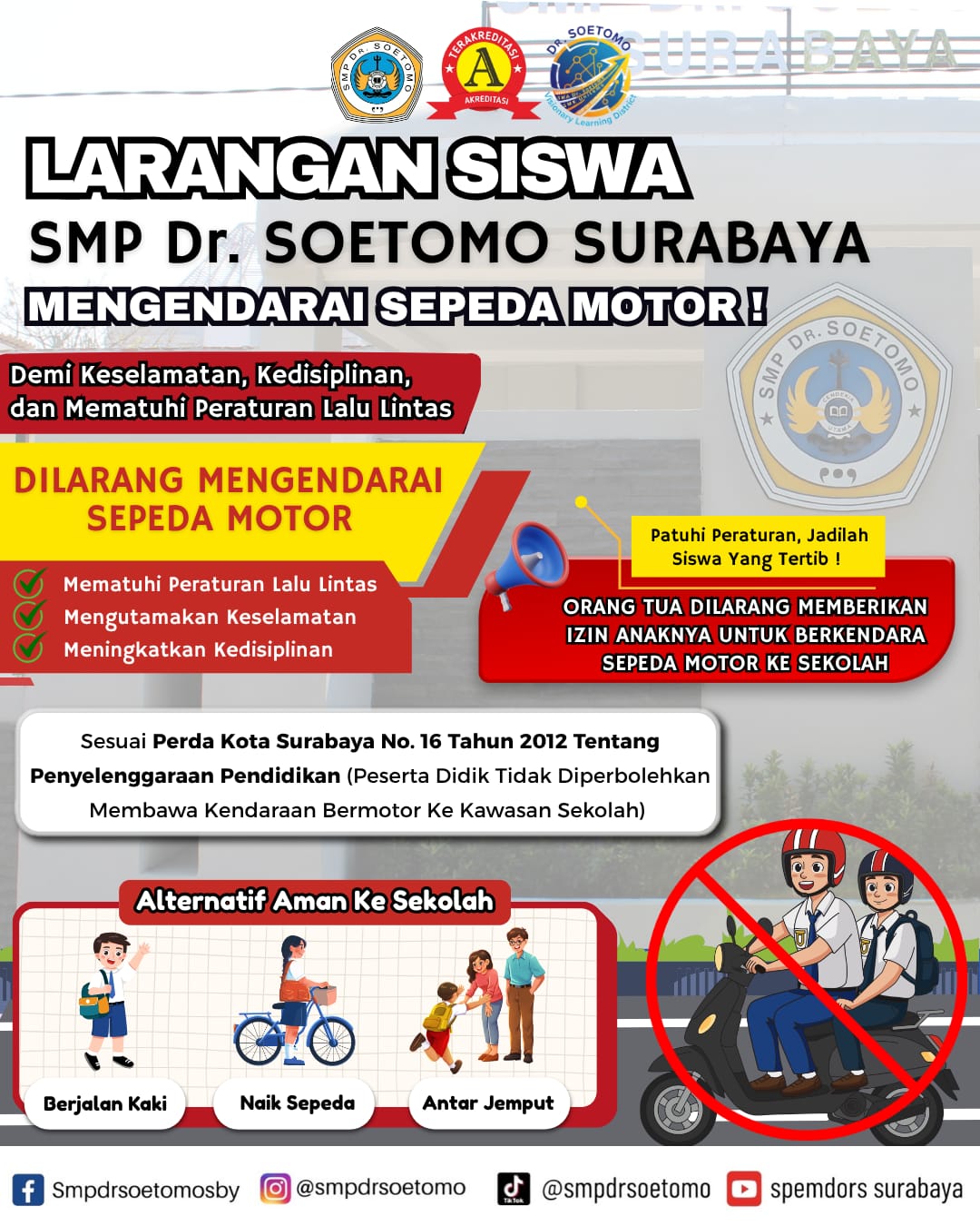 Assalamu'laikum Wr. Wb. Salam Sejahtera Om Swastiastu Namo Buddhaya Salam Kebajikan Kepada seluruh siswa, orang tua, dan stakeholder sekolah kami. Di SMP DR. SOETOMO, kami membanggakan komitmen kami untuk menyediakan lingkungan pendidikan yang berimtaq, disiplin dan berkarakter. Untuk mendukung program tersebut harus ada kerjasama yang baik antar stakeholder, mulai dari orangtua, sekolah, dan masyarakat serta pemangku kepentingan. Dengan kerjasama yang baik akan tercapai pendidikan sesuai yang kita cita-citakan. Pendidikan memang maha penting untuk meningkatkan kualitas hidup murid nantinya. Demikian, sambutan singkat kami, atas perhatian dan kerjasamanya kami ucapkan terima kasih. Hormat kami, Kepala Sekolah, Ari Afadianto, ST.